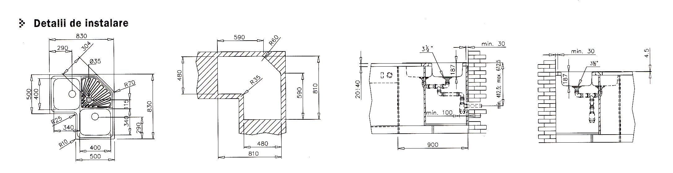 - gol de incastrare min. 90 x 90 cm ( pe colt ) sau min. 45 cm ( in linie )
